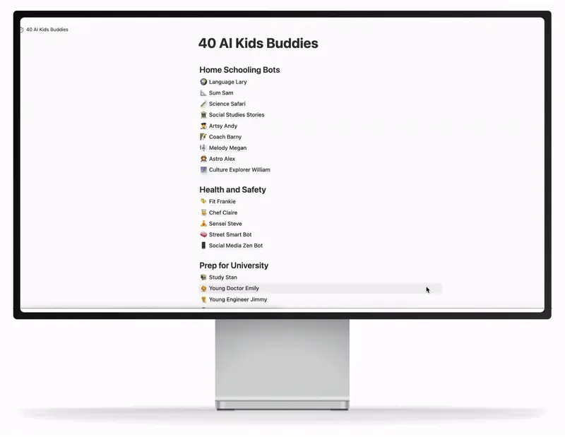 AI Buddies are 40 specialized bots, each designed to make learning fun and engaging for kids.
